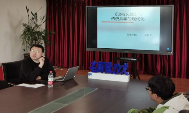 4月26日,我校举办第五期名师微沙龙——《论持久战》师生共研会。历史学院孙世平老师与青大、海大学子共研《<论持久战>与传统兵学的现代化》。